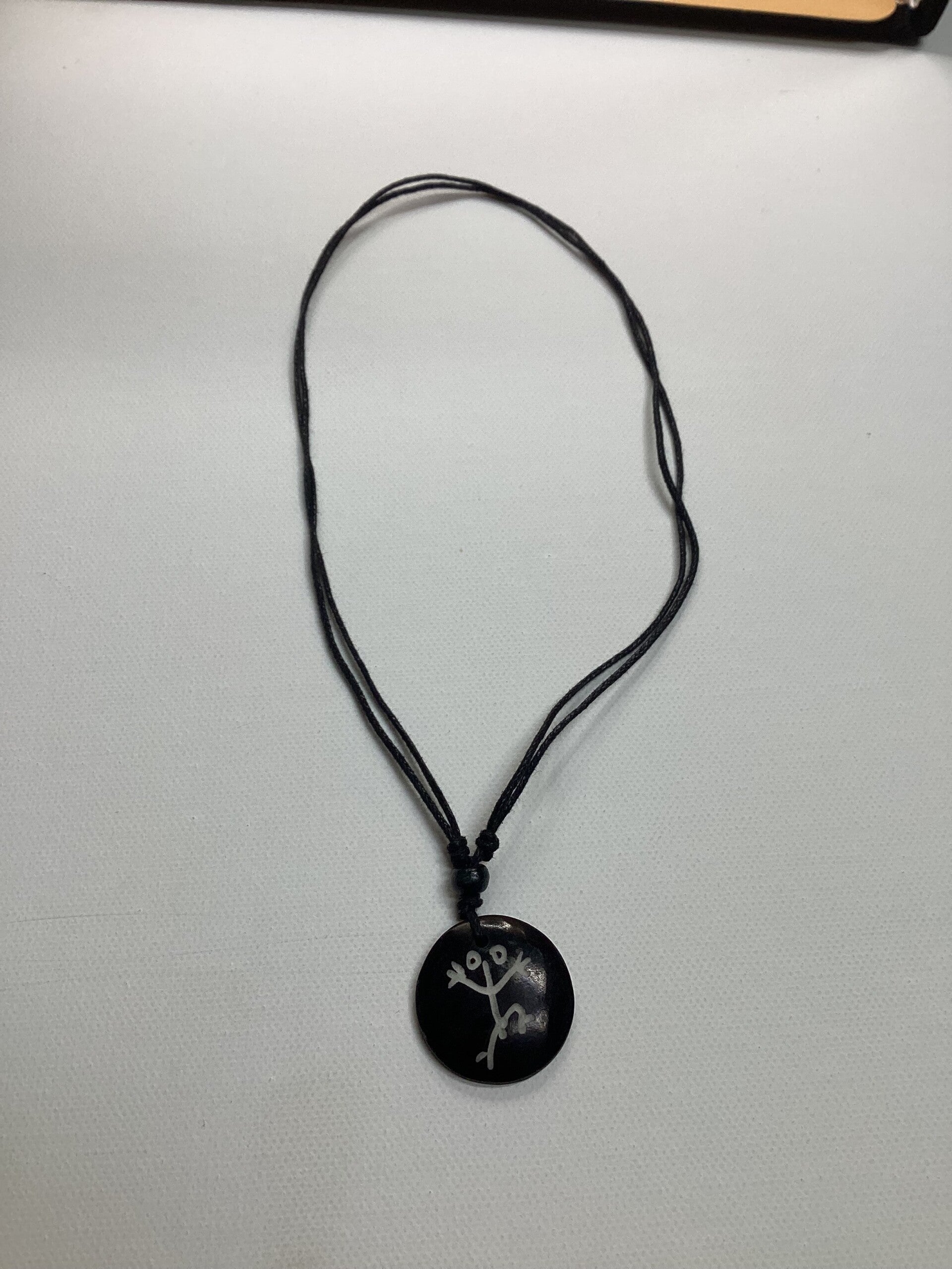 A black circular necklace with the representation of a coqui